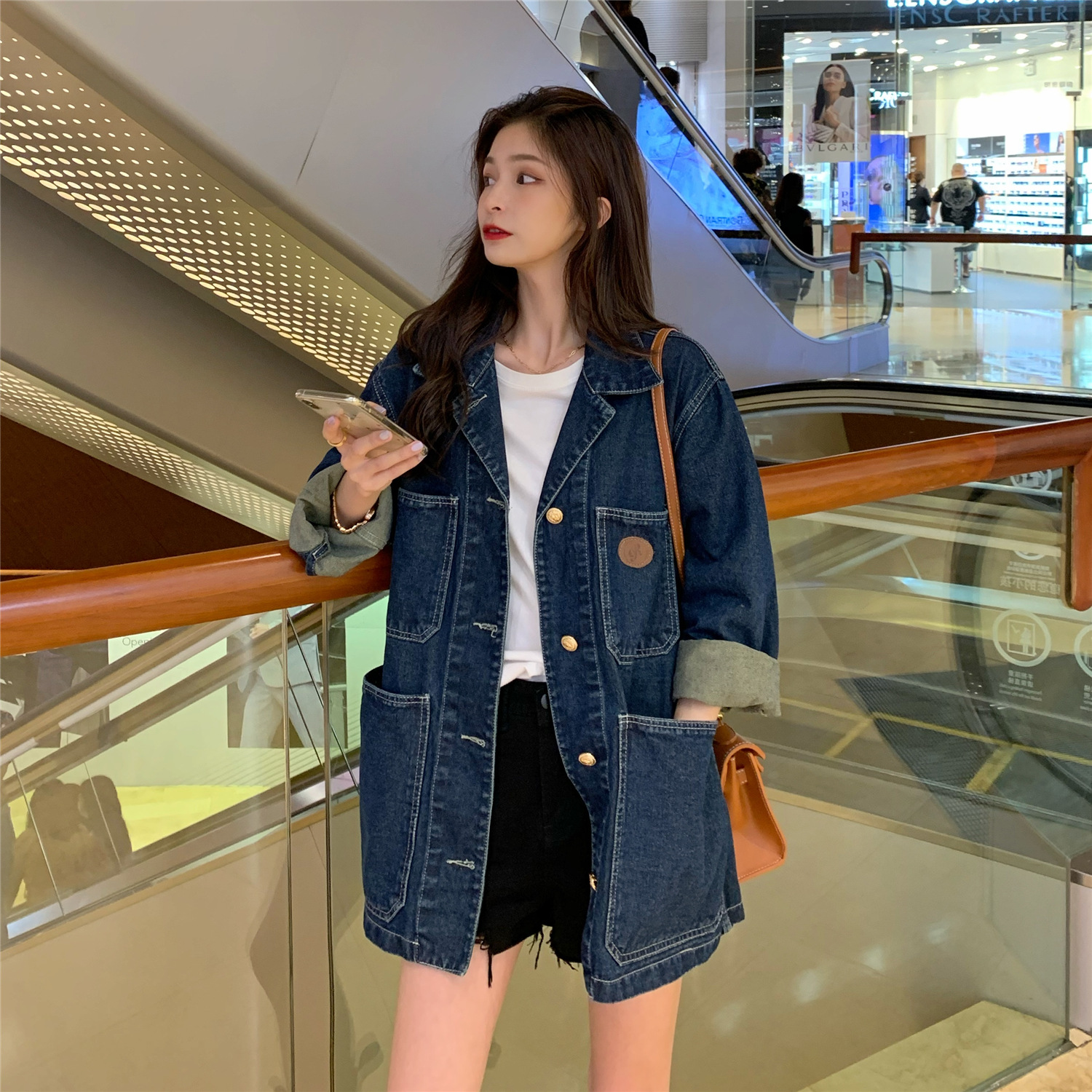 Denim Coat Women''s Spring And Autumn Korean Loose Lapel cardigan Medium Length Long Sleeve Top